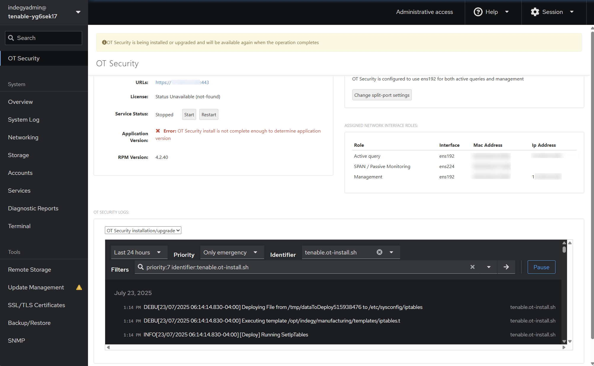 Tenable Core はインストールを開始し、黄色のバナーに「 OT Securityがインストール中またはアップグレード中です。この操作が完了してから再び使用できるようになります。」のメッセージが表示されます。