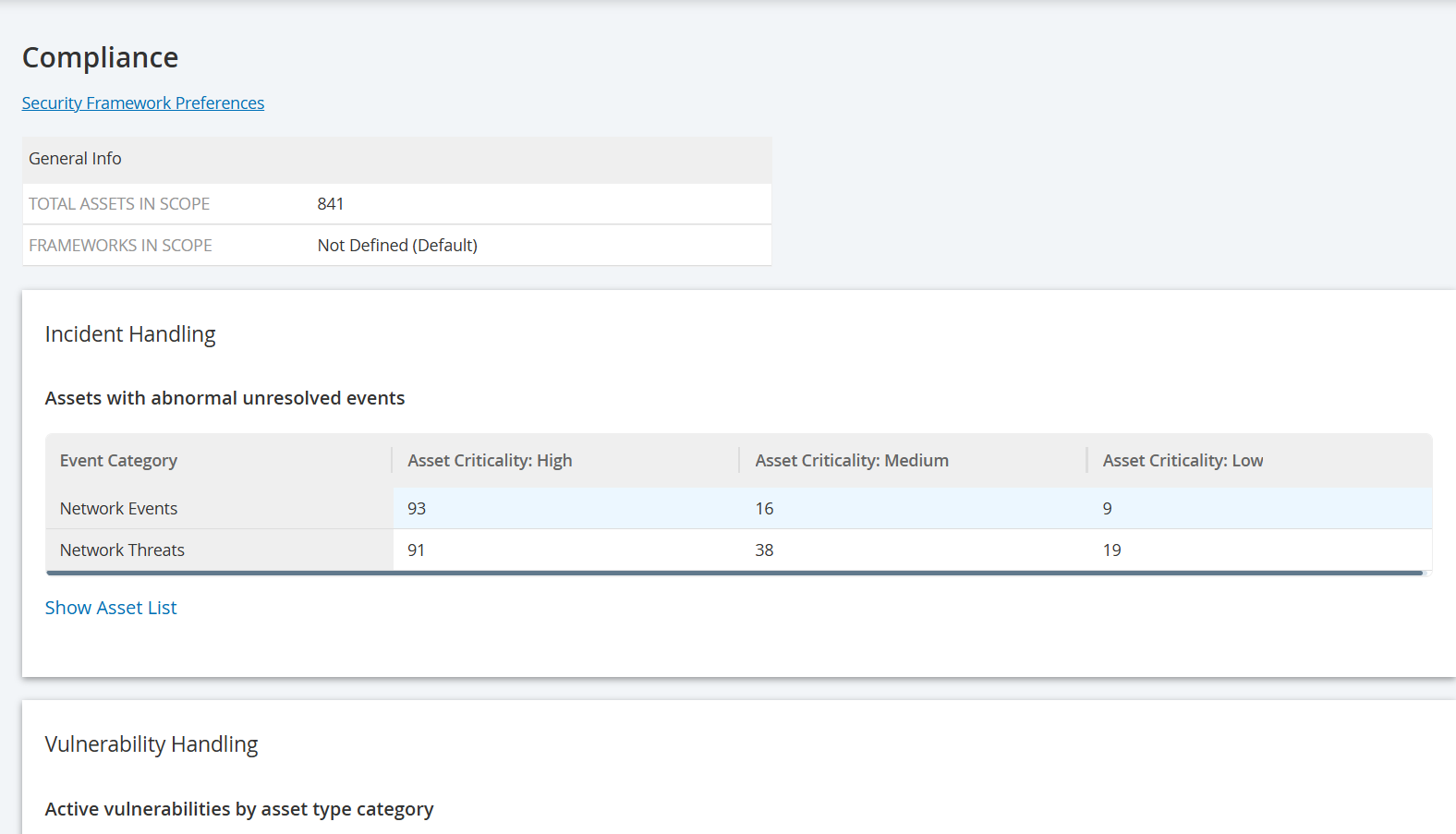 コンプライアンスフレームワークに対応していくことは、複雑なプロセスになる可能性があり、特殊な知識が必要です。[コンプライアンス] ダッシュボードでは、組織の重要な事業運営に影響を与える可能性のあるすべての資産、脆弱性、イベントの全体像を把握することができます。また、監査における次の重要な質問の答えを見つける手助けとなります。