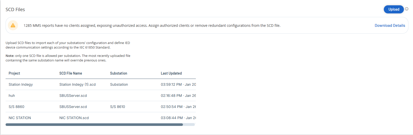 注意: 変電所ごとに 1 つの SCD ファイルのみアップロードできます。同じ変電所名を含む直近にアップロードされたファイルが、その前のファイルをオーバーライドします。 -