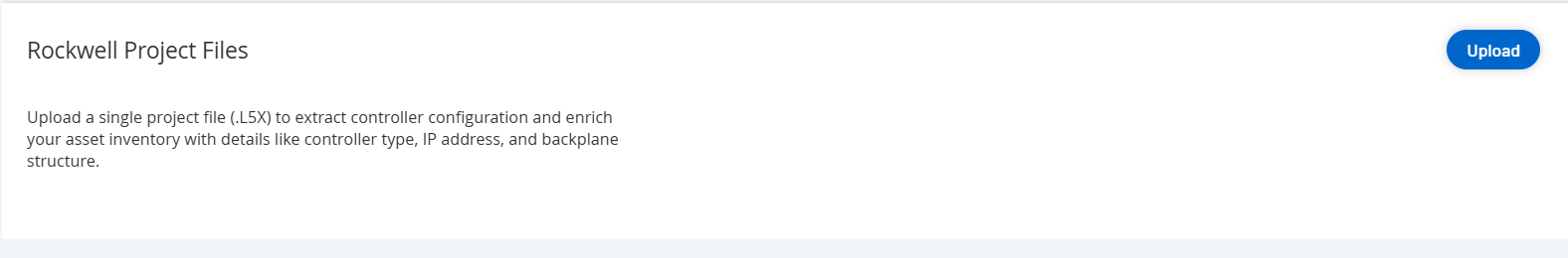 Rockwell .L5X ファイルをアップロードすることで、資産を作成し、資産の詳細を充実させ、エアギャップ環境や可視性が制限された環境で資産間の関係を構築できます。プロジェクトのファイルサイズは最大 50 MiB です。