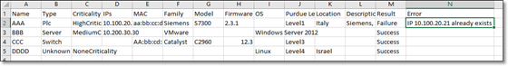 OT Security でまだ資産が検出されていなくても、インベントリを追跡するために、所有している他の資産を表示させたいと思うかもしれません。その場合は、CSV ファイルをダウンロードして編集し、ファイルをシステムにアップロードすることで、これらの資産をインベントリに手動で追加できます。アップロードできるのは、システム内の既存の資産によってまだ使用されていない IP を持つ資産のみです。同じ IP でネットワークを介して通信している資産をシステムが検出した場合、システムは検出された資産について取得した情報を使用し、以前にアップロードした情報を上書きします。ネットワークで資産が通信していることをシステムが検出すると、システムはその資産を通常の資産として扱うようになります。