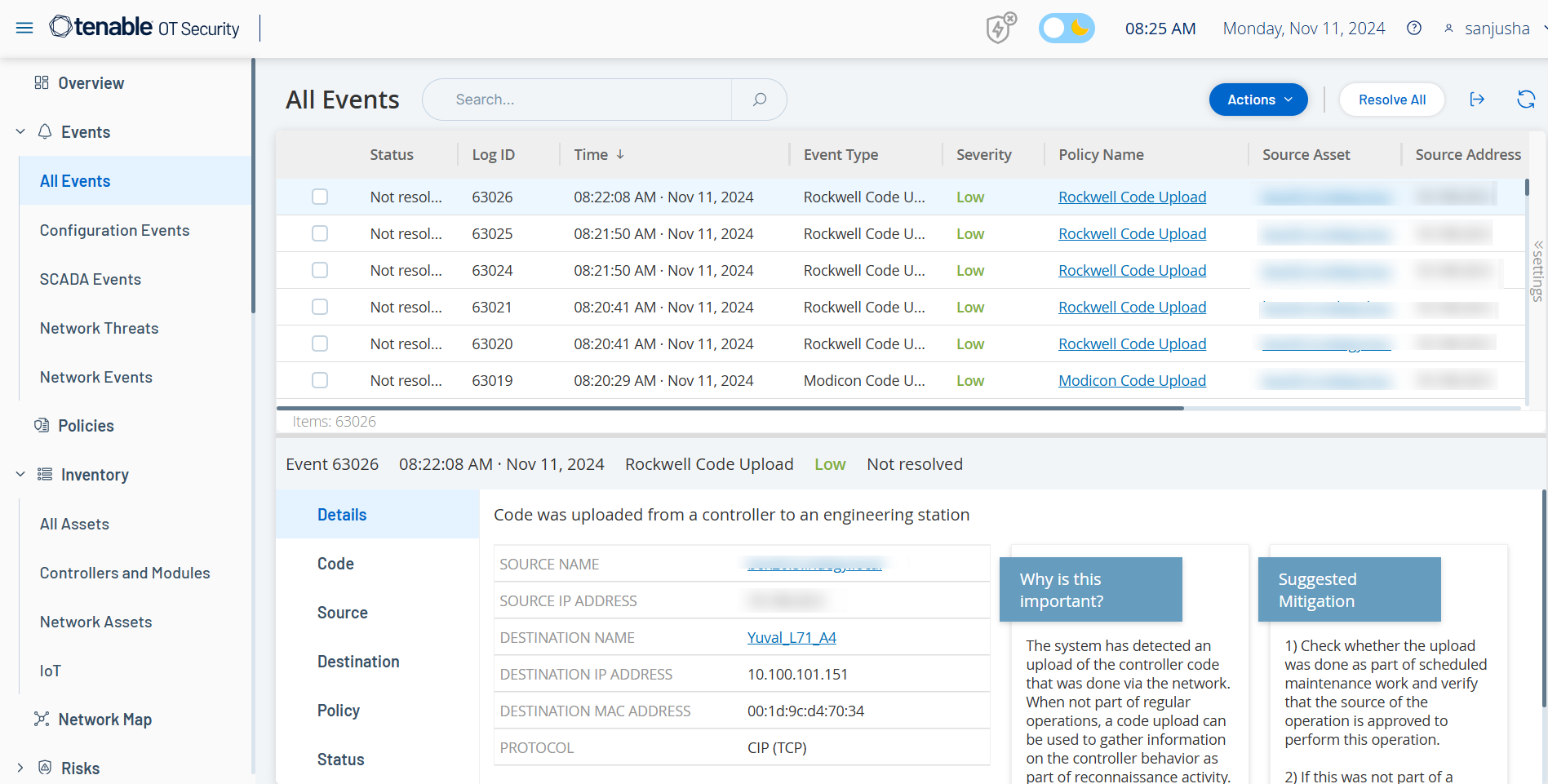 イベントは、ネットワーク内の潜在的に危険なアクティビティに対する注意を促すためにシステムで生成された通知です。OT Security システムで設定したポリシーは、設定イベント、SCADA イベント、ネットワーク脅威、ネットワークイベントのいずれかのカテゴリでイベントを生成します。OT Security は深刻度レベルを各ポリシーに割り当て、イベントの深刻度を示します。