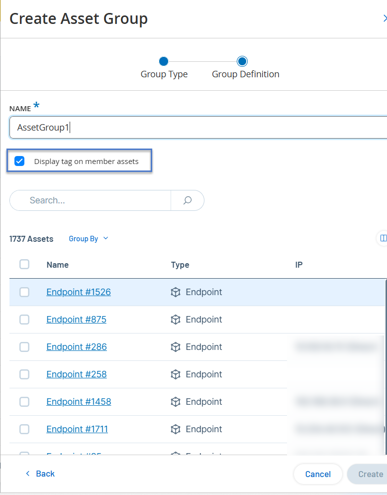 資産のタグを表示するには、資産グループの作成時に [メンバー資産にタグを表示] チェックボックスを選択します。