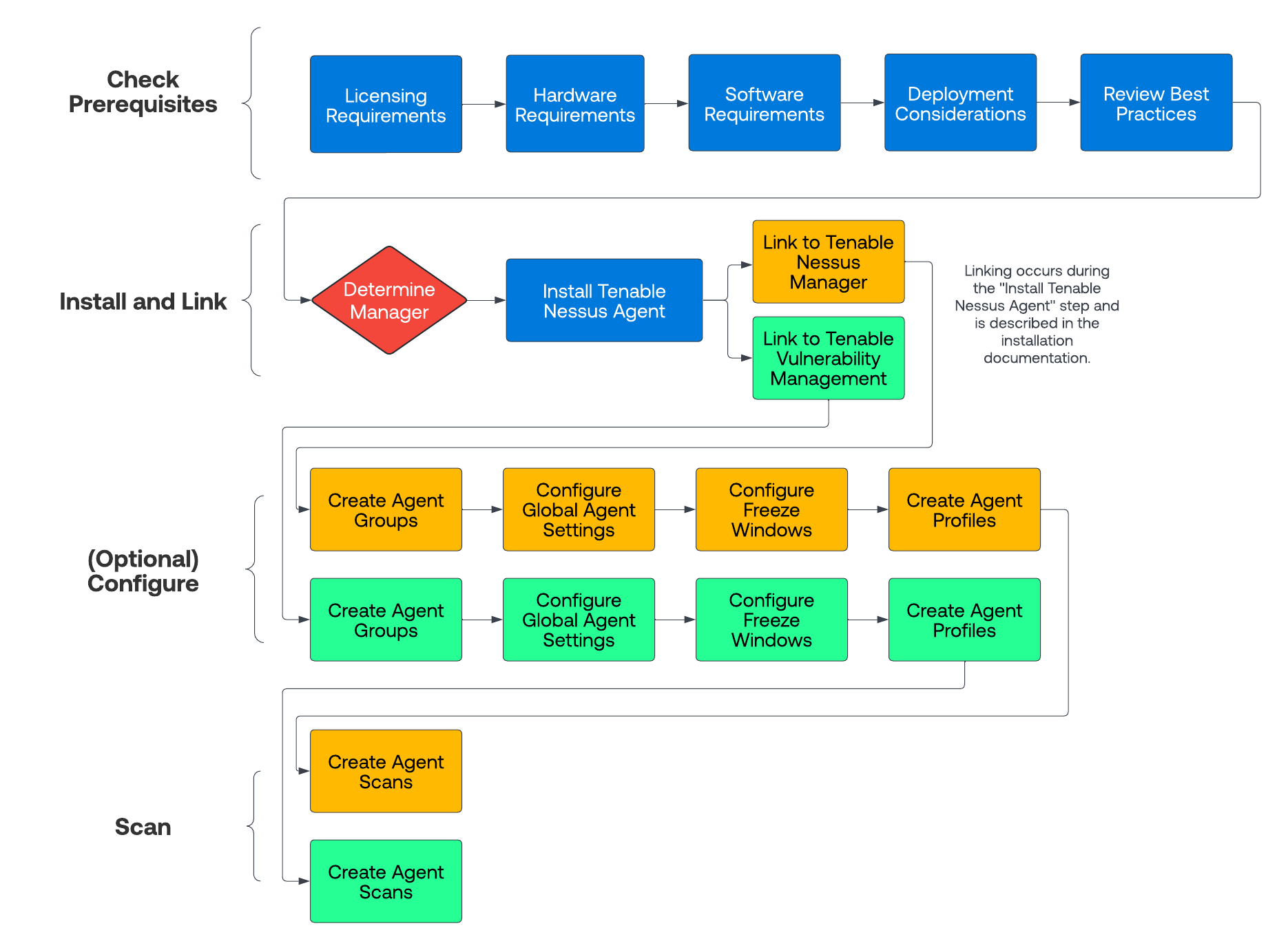 以下のドキュメントは、Tenable Agents をデプロイする際に推奨されているワークフローについて概説しています。