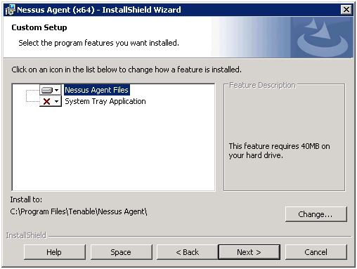 [Change] (変更) をクリックし、Tenable Agents をインストールする別のフォルダーを参照して選択し、[Next] (次へ) をクリックします。