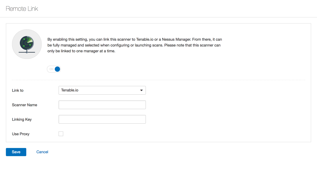 [Remote Link] (リモートリンク) ページでは、Tenable Nessus スキャナーをライセンス済み Tenable Nessus Manager または Tenable Vulnerability Management にリンクできます。