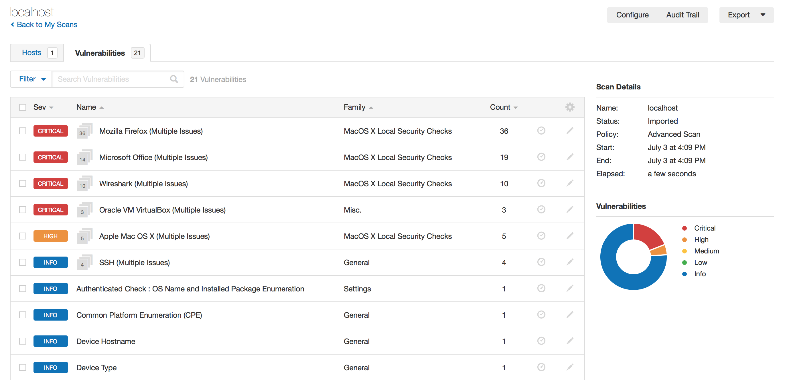 脆弱性は、プラグインによって発見された潜在的なセキュリティ問題のインスタンスです。スキャン結果では、スキャンで見つかったすべての脆弱性を表示するか、特定のホストで見つかった脆弱性を表示するかを選択できます。