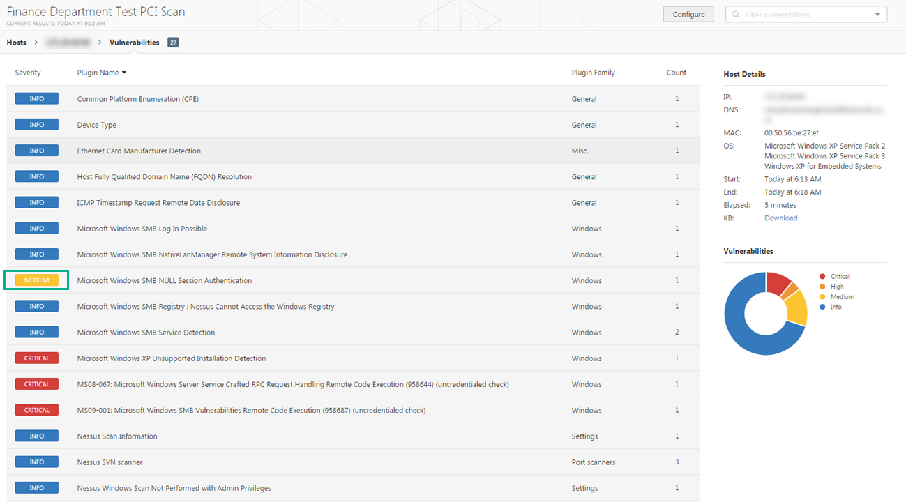 プラグインの深刻度とプラグイン名ごとの単一ホストのスキャン結果リスト |