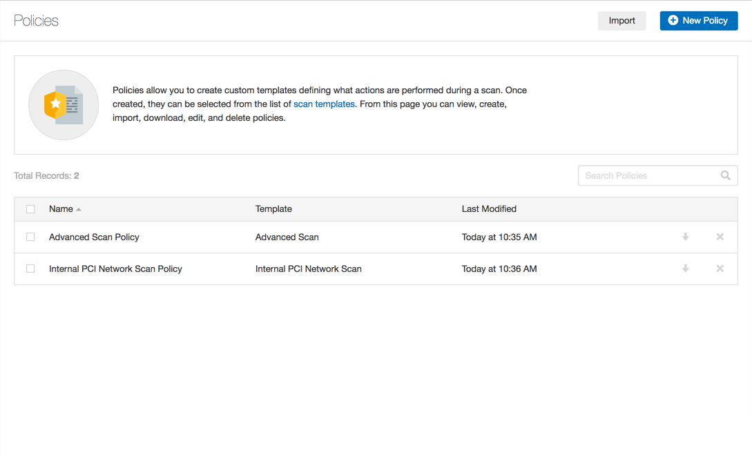 ポリシーは、スキャンの実行に関連する定義済み設定オプションのセットです。作成済みのポリシーは、スキャンを作成するときにテンプレートとして選択できます。