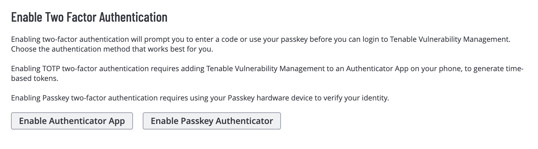 詳細については、Tenable Vulnerability Management ユーザーガイドの、自分のアカウントに二要素認証を設定するを参照してください。