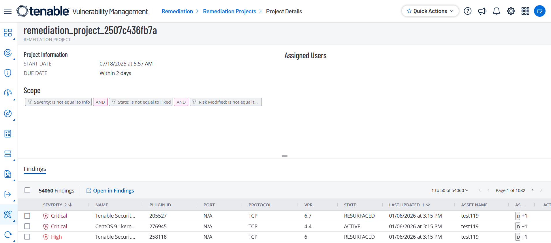 このセクションのテーブルには、修正目標に関連するすべての検出結果がリストされます。このテーブルで次の情報を確認できます。