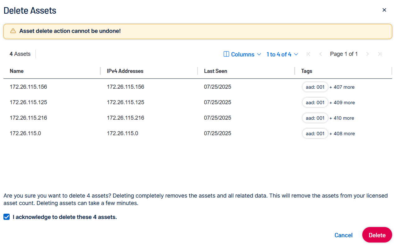 警告: 資産の削除を行うと、廃止されたホストやその他の無関係の資産を簡単にライセンス数とレポートから削除できますが、これらは完全に削除されます。この機能を使用する際は十分に注意してください。ネットワークを表示または編集するの説明に従って、代わりに [資産エイジアウト] を有効にすることを検討してください。
