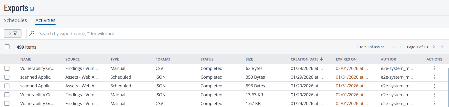 [エクスポート] > [アクティビティ] をクリックします。[エクスポート] ページが表示され、[アクティビティ] タブが表示されます。このタブには、Tenable Vulnerability Management アカウントのすべてのエクスポートが含まれるテーブルが表示されます。