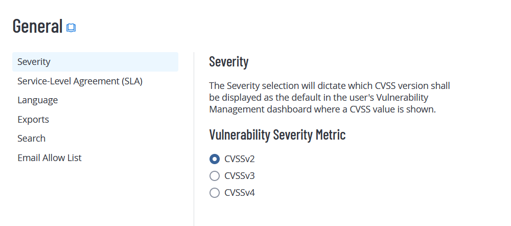 デフォルトでは、Tenable Vulnerability Management は CVSSv2 スコアを使用して、個別の脆弱性インスタンスの深刻度を計算します。Tenable Vulnerability Management が CVSSv3 または CVSSv4 スコアを使用して脆弱性の深刻度を計算する場合は、深刻度メトリクスを設定できます。