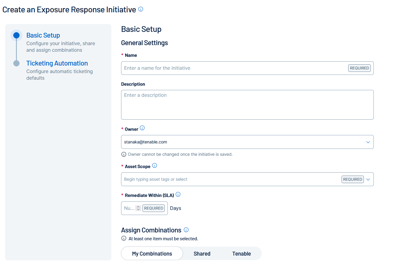 オプション 説明 名前 (必須) イニシアチブの名前を入力します。 説明 イニシアチブの説明を入力します (例: 外部アタックサーフェスの削減)。 所有者 Tenable Vulnerability Management ユーザーのリストからイニシアチブの所有者を選択します。作成したイニシアチブを再割り当てすることはできません。