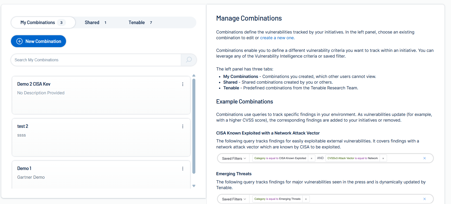 Tenable Vulnerability Management は共有された組み合わせをコピーし、[組み合わせ] リストの [マイ組み合わせ] セクションにリストします。